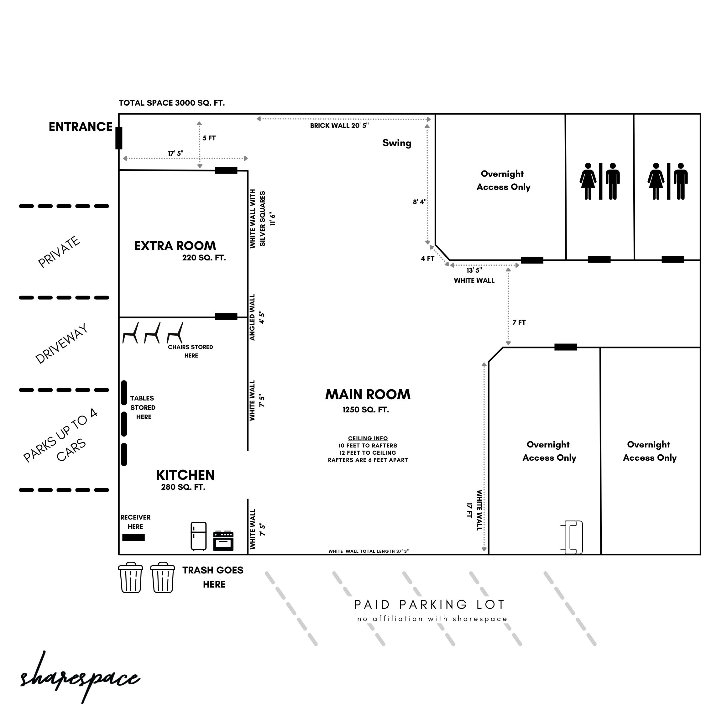 PARKING FOR EVENTS: The private driveway in front of Sharespace – Preston St. parks up to 4 cars. The parking lot to the right is a paid public parking lot. It is conveniently located next door but we have no affiliation with this public lot. They TYPICALLY charge $5 per car but will increase the rate if there’s a game or something happening in the area. We do not have information about their rates ahead of time, it’s what’s posted on their pay station. Our experience is that they don’t raise the rate unless there’s a public event happening in the area. Please be sure your guests pay them. There’s a pay station if no attendant. If the pay station is not working for some reason, let us know and we will do our best to help fix the issue. We cannot guarantee or control their actions, Sharespace is not responsible for this parking lot. This paid public lot is not free at any time. They will boot for non-payment. PLEASE NOTE: Full day rentals are subject to additional/all day parking fees. The parking lot to the left of us is a private lot for next door, there is no parking available at this lot. YOU WILL BE TOWED. There is also metered street parking around the building
